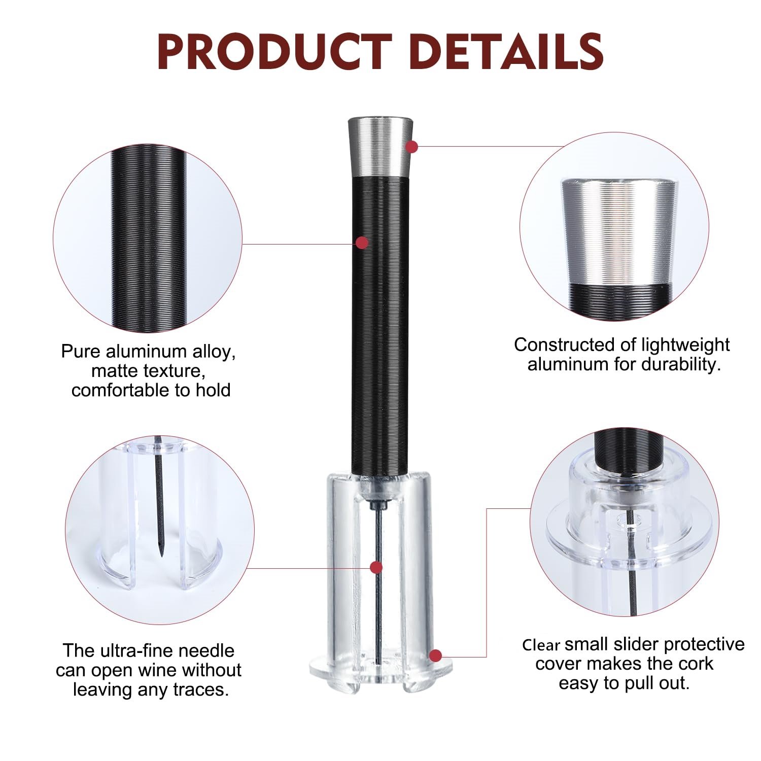 Our Wine Opener features a long, fine needle designed for precision, ensuring that you open your wine bottle correctly every time. No damage to the cork, no cork pieces, and no pulling, twisting, or broken cork.