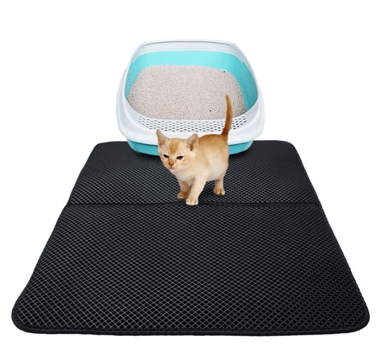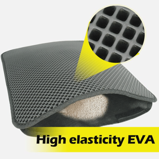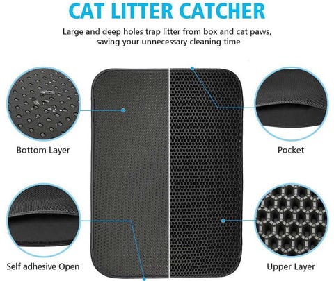 This litter mat has a "honeycomb" top layer that allows the litter to slide through the hole & capture it on the sturdy rubber bottom.